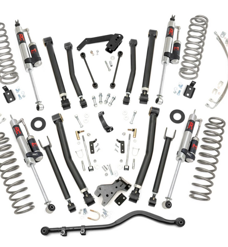 Total Transformation for Your Jeep: Elevate your ride with Rough Country's 6-inch X-Series Suspension Lift, a complete kit designed to deliver aggressive style and unbeatable off-road performance.Precision Suspension Tuning: This all-inclusive kit features front and rear upper and lower adjustable control arms with a high-clearance design, allowing you to dial in the perfect ride height and suspension setup. Lifted coil springs paired with coil correction plates optimize spring angles for superior vibration dampening on any terrain.Unmatched Strength and Adjustability: For the toughest trails, the forged solid steel adjustable track bar provides exceptional durability and axle centering. Weighing 16 pounds, this heavy-duty component installs easily and adjusts on-vehicle for precise alignment.Customizable Shock Performance: Comes standard with Rough Country's N3 Series shocks, featuring 10-stage variable valving and a high-pressure nitrogen charge for smooth highway comfort and excellent off-road control. For drivers seeking maximum performance, upgrade to premium M1R monotube shocks with faster heat dissipation, enhanced damping, and superior off-road handling.