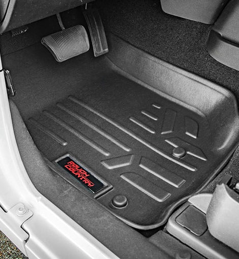 Where simple rubber floor mats fail, Rough Country's line of Floor Armor is guaranteed for life and will never crack, split, or break-down over time. The high-quality design extends the lifespan of your carpets and the raised-lip design ensures your interior will always be protected from mud, moisture, and more.